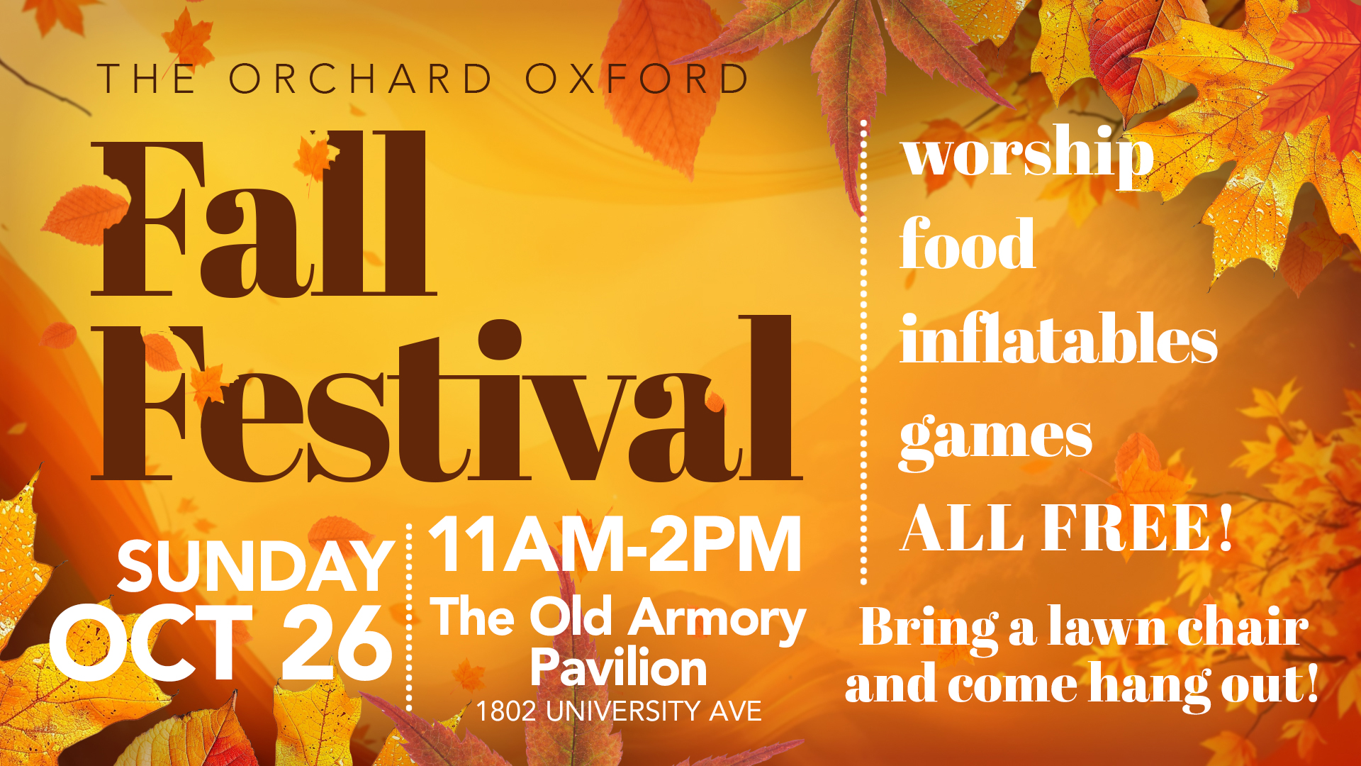 Event Details Date: Saturday, October 26 Location: Old Armory Pavilion Schedule: Worship (outdoors): 11:00 AM Fall Fest: 12:00–2:00 PM What to Expect: Family-friendly games, food, and plenty of space to hang out and enjoy the day.
