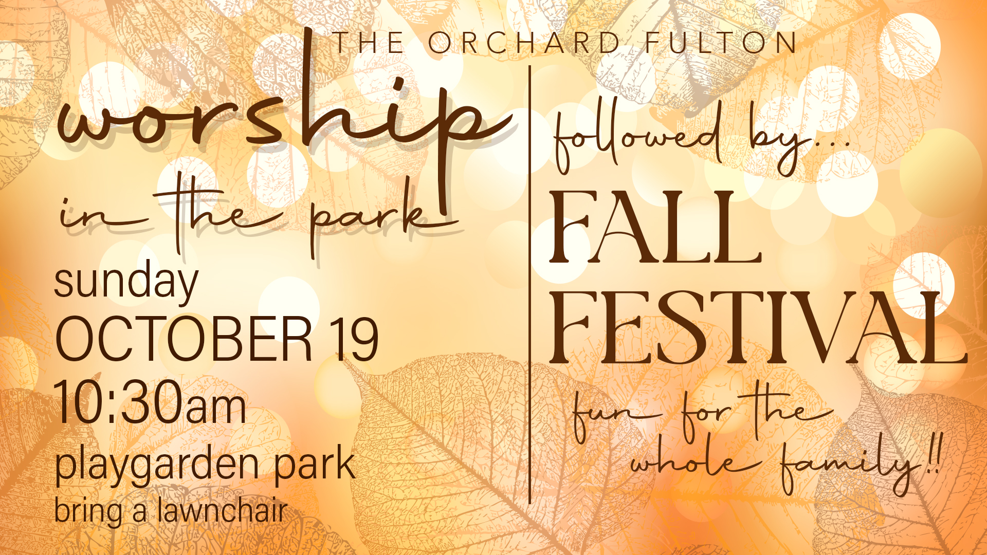 Join us for a special Sunday outdoors! We’ll gather for worship in the park and then stay for a family-friendly Fall Festival, with games, candy, food, and plenty of time to connect. Date & Time Sunday, October 19 • 10:30 AM Location Playgarden Park (Fulton) Bring a lawn chair or blanket. What to Expect Outdoor worship service with music, message, and prayer Fall Festival immediately following—games, inflatables, food, and more Fun for all ages
